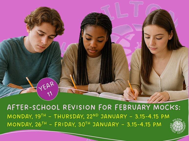 Don't forget that two weeks of Year 11 revision classes began after school this week to support you in your February mock exams. More information here. Mock exam timetable here.