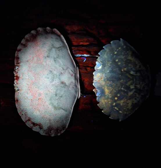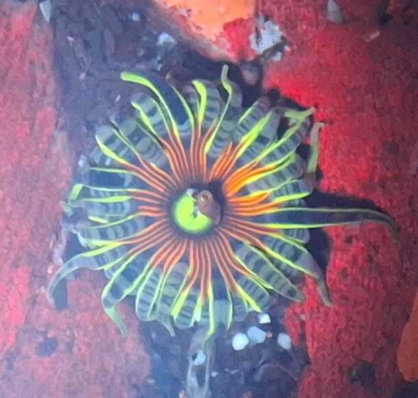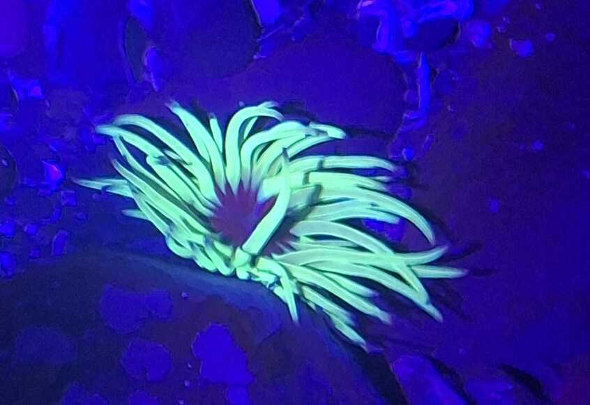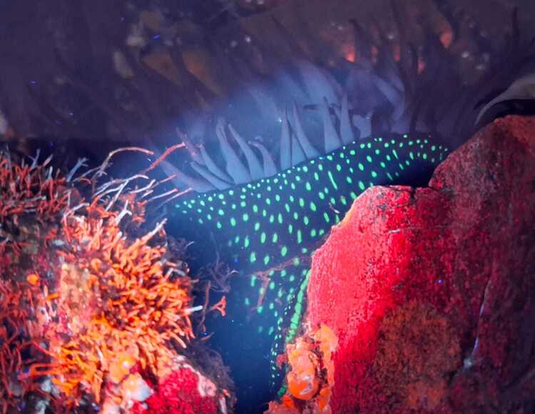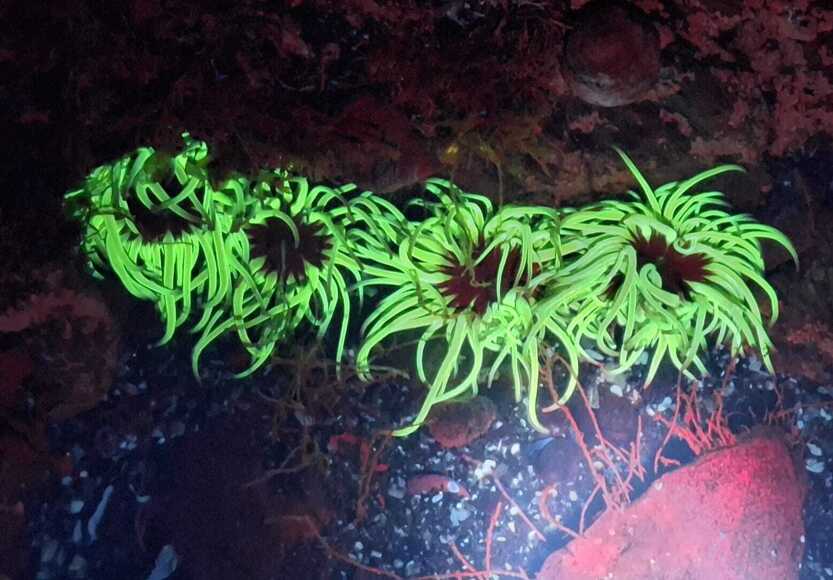 Some intrepid Ocean Explorers and their families joined the Earth Action North Devon team one evening for a Twilight rock pooling session. They started the session in daylight and explored rock pools at low tide. As the evening got darker, they used UV torches to illuminate the rock pools and saw how the rock pool flora and fauna glow in some very cool colours in UV light!
