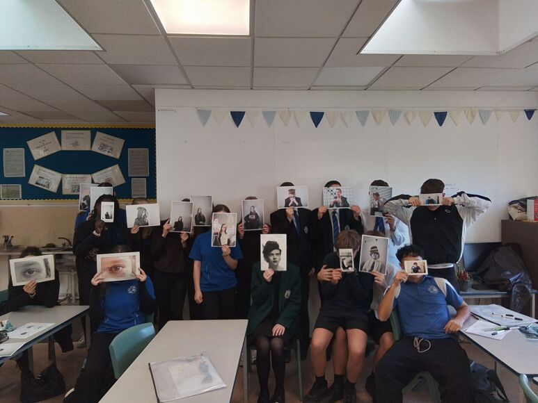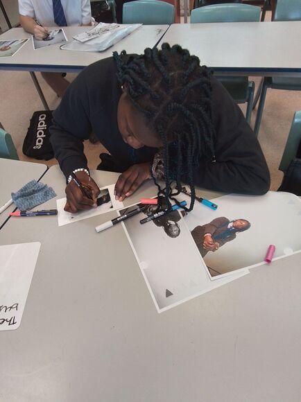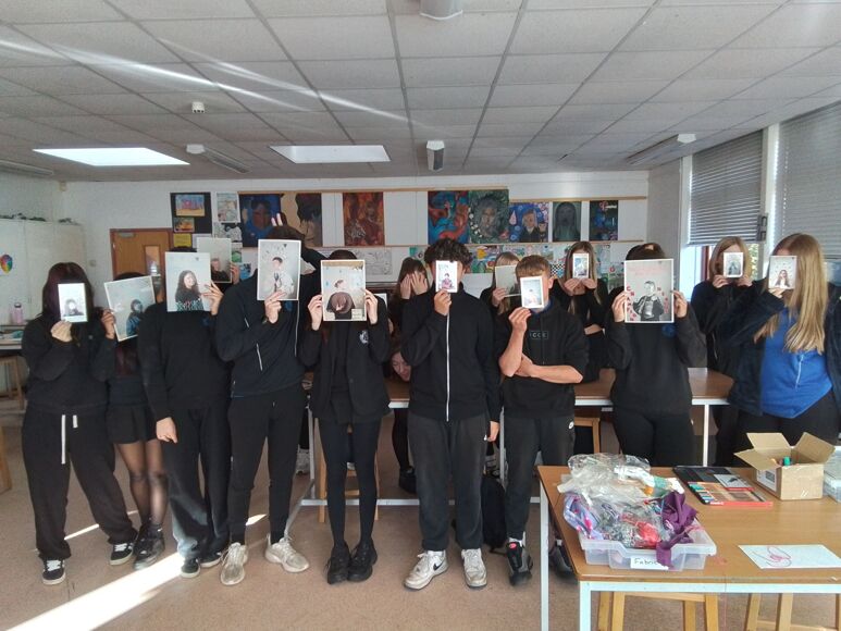 This term our Year 11 GCSE Art students have been really lucky to spend some workshop time with photographer Carole Evans. Over a couple of sessions, Carole came i to lessons to teach students how to capture professional portrait-style photographers and not just 'selfies'. Students got to explore studio key lighting, low light and natural light set ups with digital SLR cameras. Once the best portraits had been printed, students then got the chance to draw and stitch into their portraits, exploring the question 'What one word captures being a young adult in 2025?